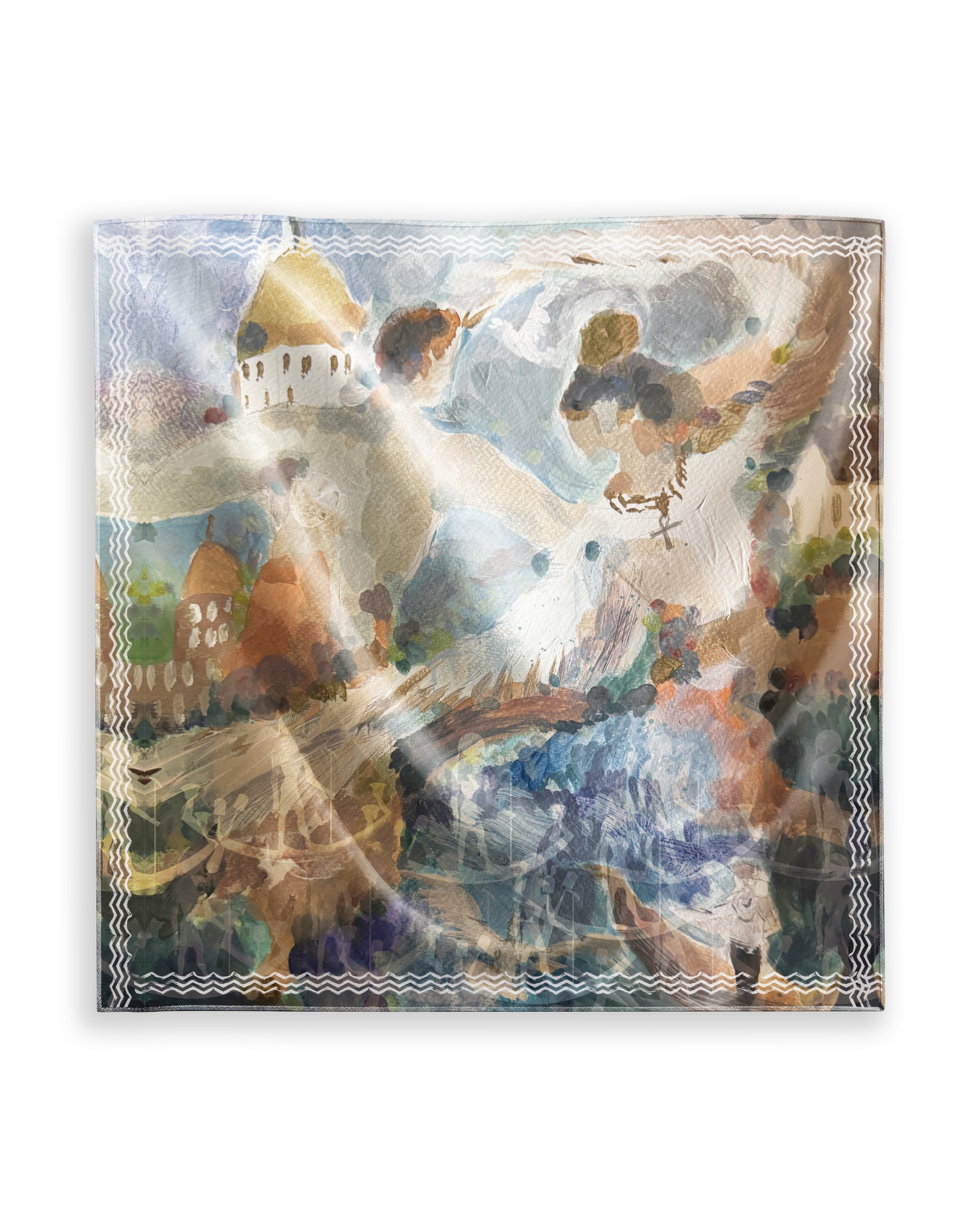 Deena Fadel’s Brushstrokes of Isis merge with Shosha Kamal’s sacred symbols of Ancient Egypt in a beautifully woven scarves collection.